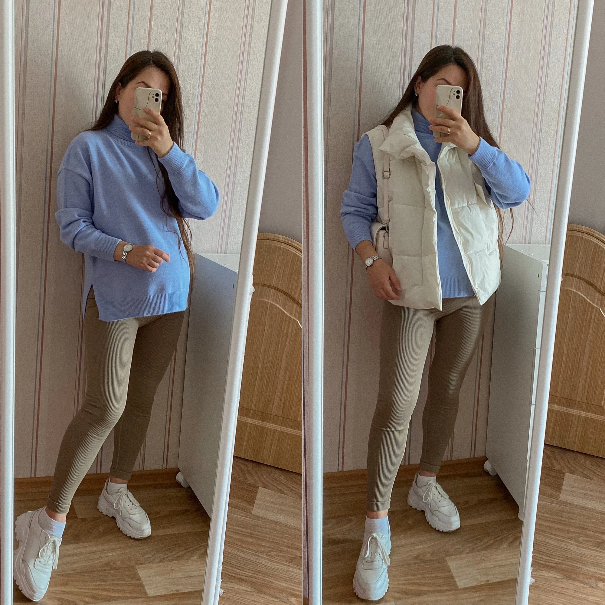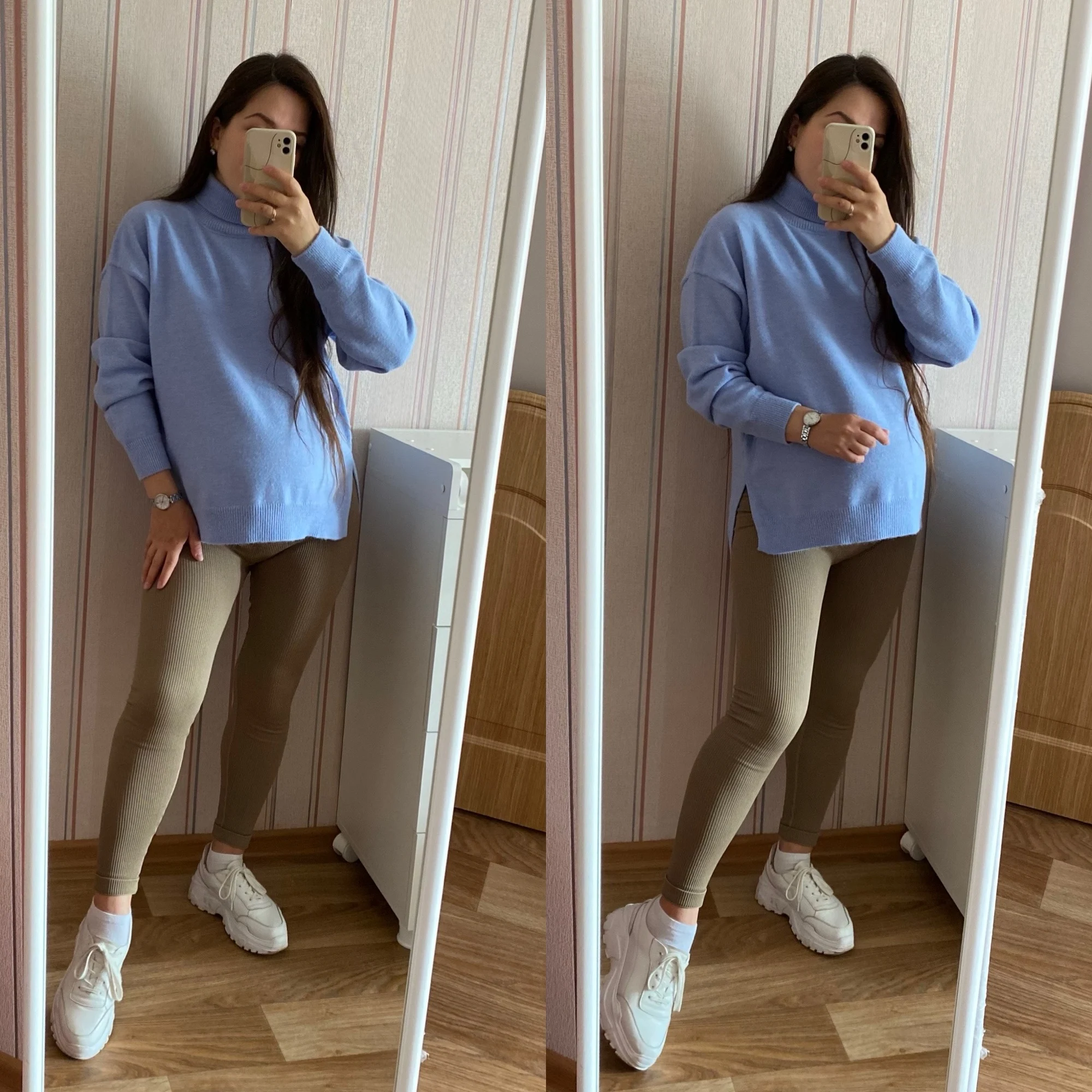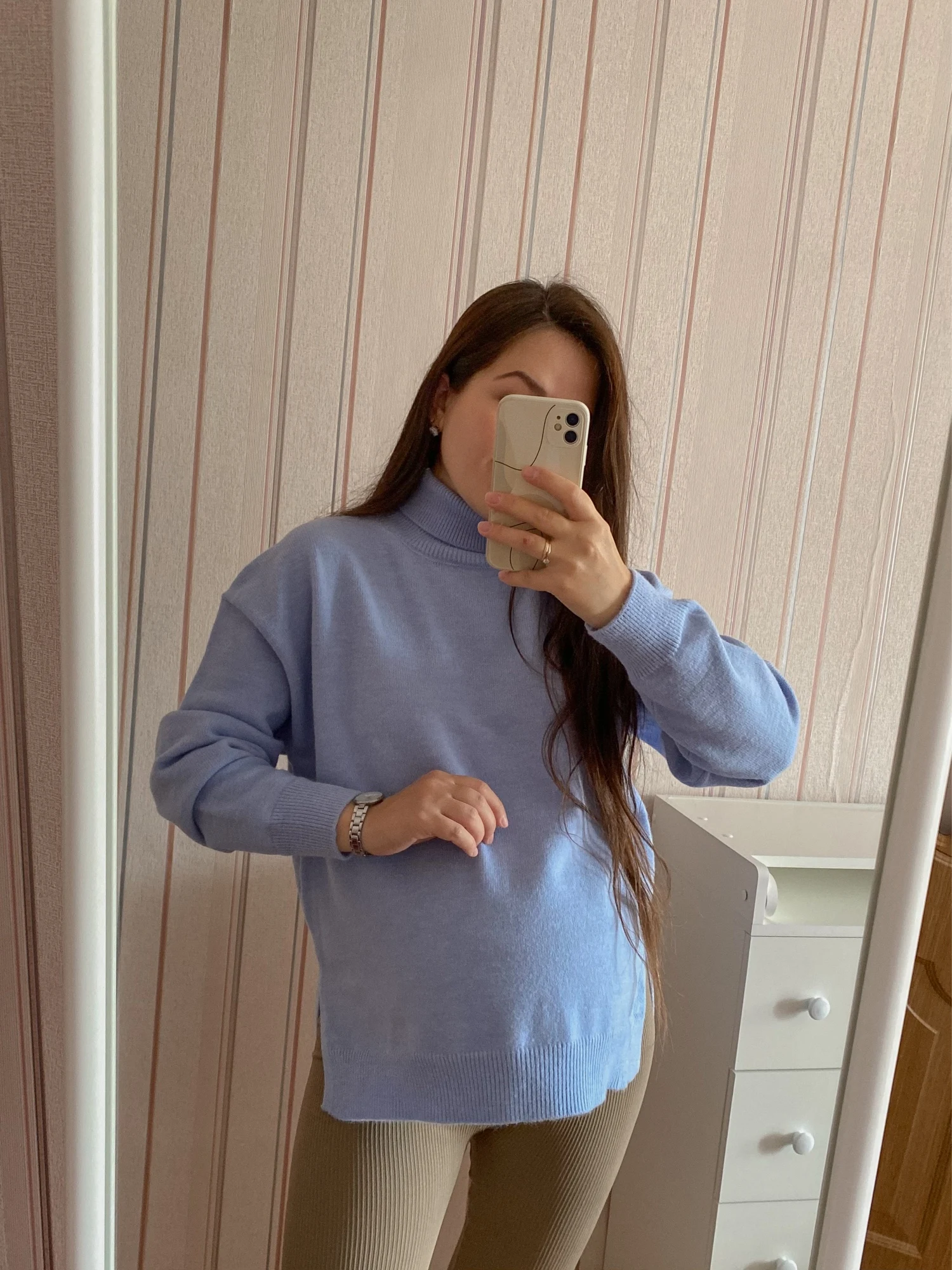 Pull de base très cool, va très bien, couvre le ventre, j'aime ça! Le tricot est doux et agréable, stretch, non visible